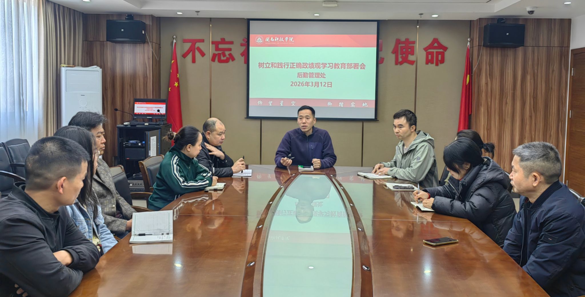 为深入贯彻党中央及学校党委关于开展树立和践行正确政绩观学习教育的部署要求,统一思想、压实责任、推动落实。3月12日上午,后勤管理处召开专题部署会。会议由校长助理王育海主持、全体办公室人员及部分水电工,驾驶员参会。